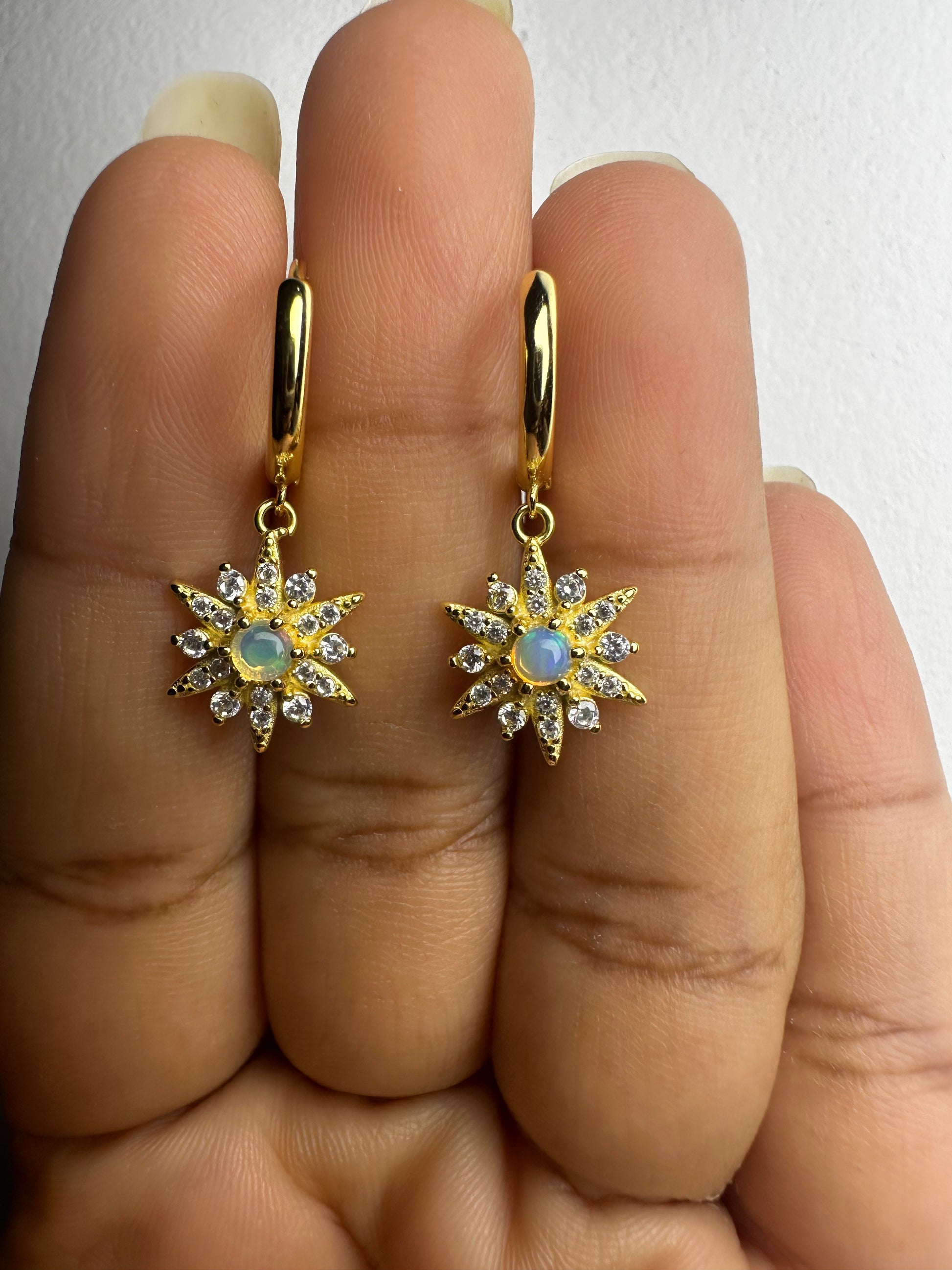 Crafted with expert precision, our Nebula earrings feature 18k gold plated 925 silver hoops embedded with shining cubic zirconia crystals and ethereal opals. Elevate any outfit with these timeless and luxurious statement pieces.