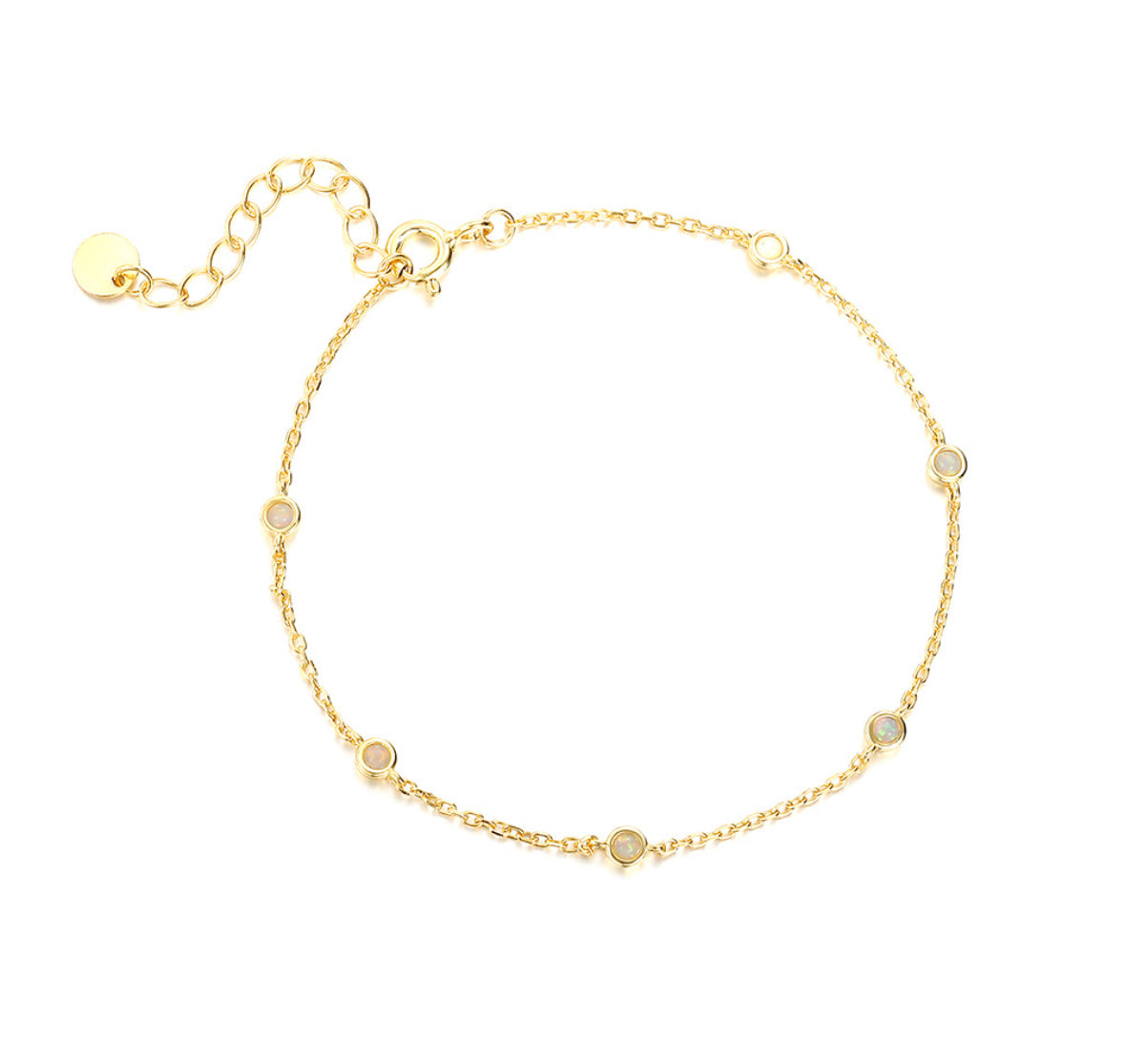 This 92.5 silver bracelet is studded with Opal stones and coated with 18k gold plating. It is designed for everyday wear and is anti-tarnish and waterproof. Enjoy its elegant and durable design, perfect for any occasion.